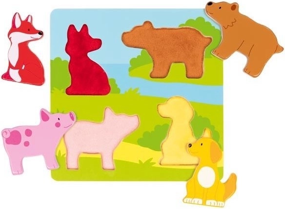 Ta kakovostna lesena vstavljanka s štirimi živalicami (lisica, kuža, medved, pujsek) skriva pod izrezanimi odprtinami tipne površine, ki posnemajo njihovo dlako ali kožo. Otroci pri igri vključujejo vid in dotik ter lažje povezujejo oblike, barve in čutno zaznavanje.