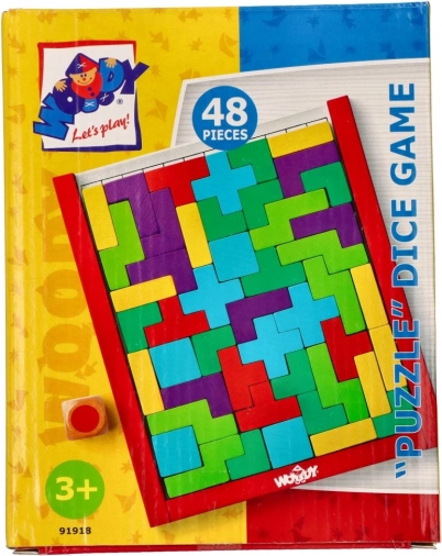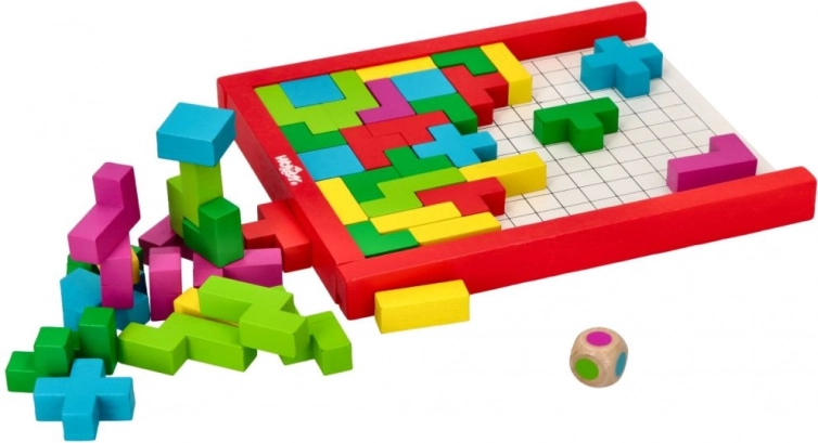 Lesena sestavljanka Puzzle Tetris za otroke od 3 let spodbuja ustvarjalnost in logično razmišljanje. Pisani koščki in igralna kocka.