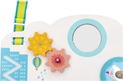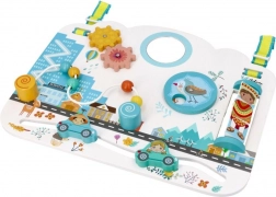 Interaktivni elementi, kot so zobata kolesca, drsne perlice in avtomobilčki, varno netežkočilno ogledalce ter vrtljivo kolesce s skritimi živalicami, spodbujajo fino motoriko, zbranost in razumevanje vzročno-posledičnih povezav. Zahvaljujoč nastavljivim trakcem je tabla praktična doma in na poti – lahko jo postavite pred otroka ali obesite na posteljico.