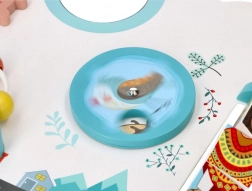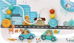 Dve zobati kolesi, drsne perlice in avtomobilčki ter vrtljive figurice urijo prijem, koordinacijo in logično razmišljanje.