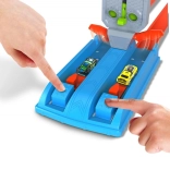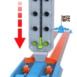 Mehanski dvokanalni zaganjalnik hkrati izstreli avtomobilčka – idealno za head‑to‑head dvoboje in merjenje reakcij brez baterij.