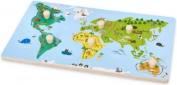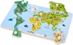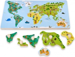 Sestavljanka prikazuje celine z izrazitimi barvami in narisanimi živalmi ter znamenitostmi, kar otrokom olajša učenje in geografijo naredi zabavno.