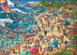 Sestavljena uganka meri približno 70 x 50 cm in je idealna za skupne družinske trenutke ali sprostitev v samoti. Potopite se v živahno vzdušje plaže, kjer ljudje uživajo v surfanju, plavanju in počitku pod sončnim dnevom.