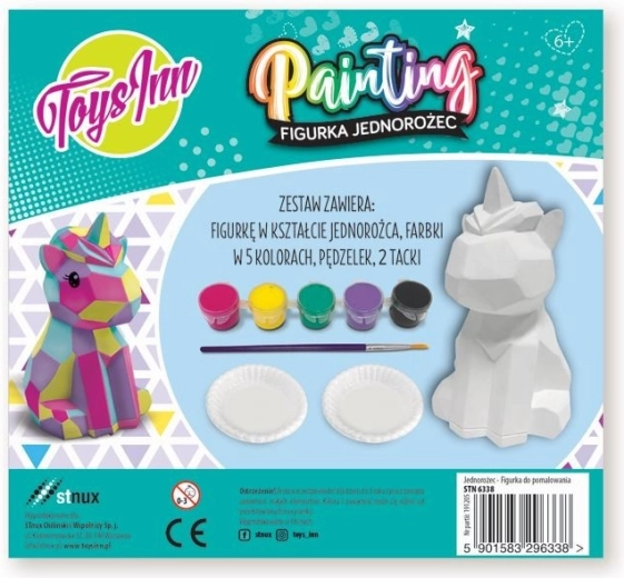 Komplet vsebuje figurico samoroga za barvanje, 5 barv, čopič in dve posodici za mešanje barv.