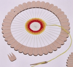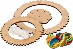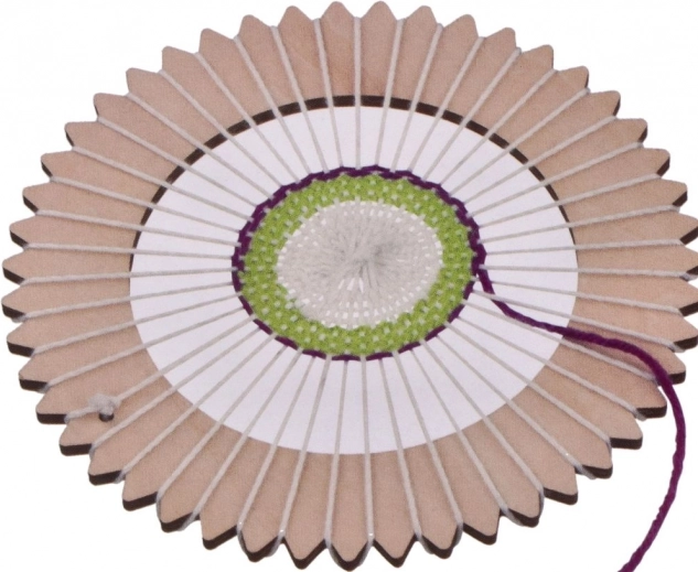 Leseni krožni okvirji z nazobčanim robom stabilno držijo osnovo, zato so vzorci natančni, delo pa udobno tudi za začetnike.