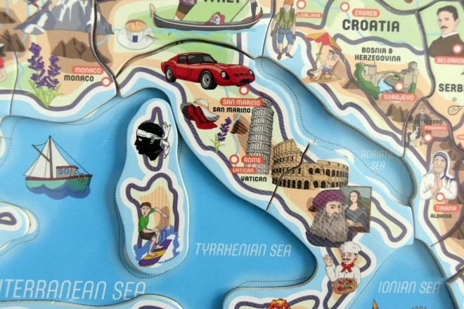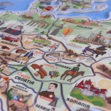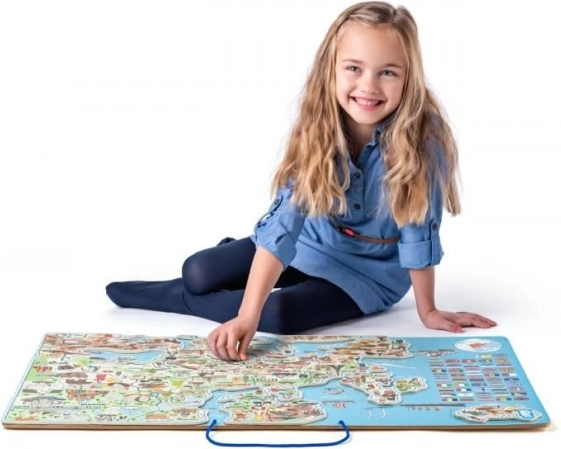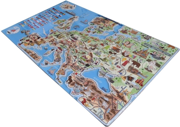 Ta interaktivni zemljevid Evrope otrokom omogoča dojemanje Evrope kot celote, polne zanimivosti. Otroci lahko polagajo kose, ki predstavljajo posamezne države, na magnetno podlago, kar jim pomaga utrditi znanje o položaju držav na stari celini. Zaradi slik na koščkih otroci zlahka prepoznajo značilne elemente posameznih držav, kot so arhitekturne znamenitosti, naravni viri ali za območje značilna proizvodnja.