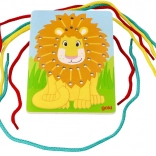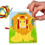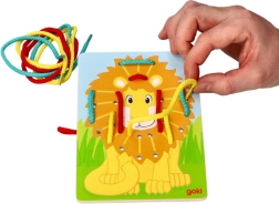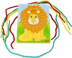 Lev v živih barvah z luknjami za enostavno vezanje vrvic, ki prispeva k razvoju fine motorike.