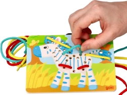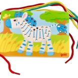 Barvna lesena zebra z luknjami za vrvice, idealna za učenje koordinacije rok in oči.