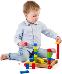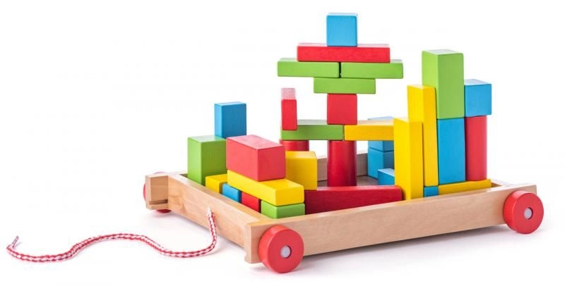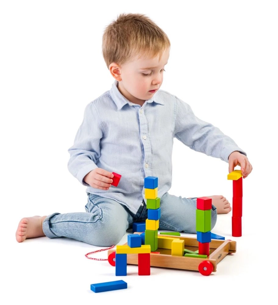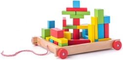 Leseni voziček s kockami je brezčasna igrača, ki združuje gibanje in ustvarjanje. Otroci lahko voziček vlečejo po sobi ter iz kock zlagajo stolpe, hišice in preproste zgradbe. Žive barve naravno vabijo k igri ter urijo prepoznavanje oblik in barv.