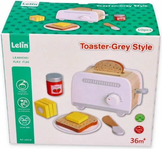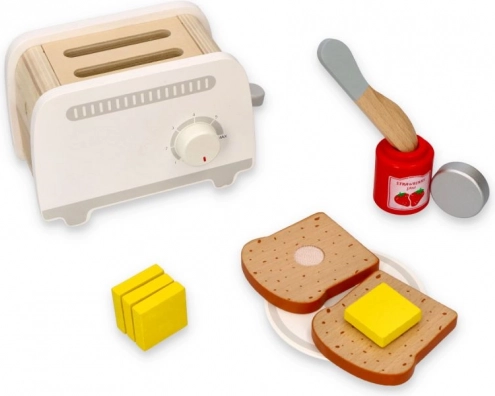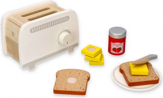 Ta kakovosten leseni toaster (otroški toaster) je odličen dodatek vsaki otroški kuhinjici. Otroci lahko nastavijo »stopnjo zapečenosti« z vrtljivim gumbom, pritisnejo ročico in postrežejo zajtrk s kruhom, maslom in jagodno marmelado. Igra spodbuja domišljijo, osredotočenost in skupno igranje.