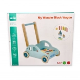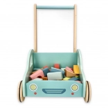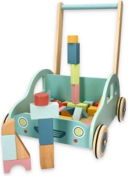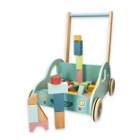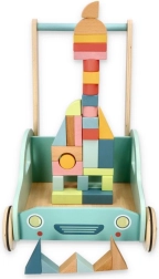 Gumirani trakovi na kolesih zagotavljajo boljši oprijem s tlemi in tišje delovanje. Voziček ima dovolj prostora za shranjevanje barvnih lesenih kock, zato se učenje hoje naravno poveže s prosto igro in gradnjo. Sestavljanje je preprosto – po odstranitvi iz škatle pritrdite le dve navpični plošči in zgornji ročaj (vijaki so priloženi, izvijač ni del kompleta).