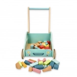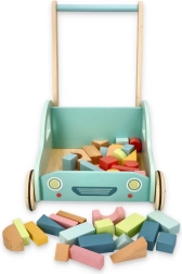Barvne lesene kocke razvijajo fino motoriko, domišljijo in logično mišljenje. Voziček služi kot praktičen shranjevalni prostor za kocke in končane gradnje.