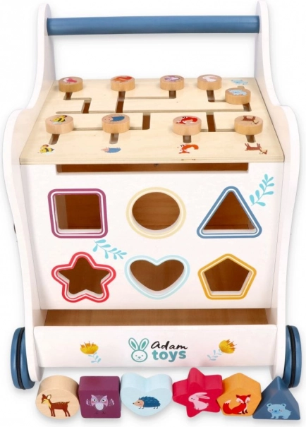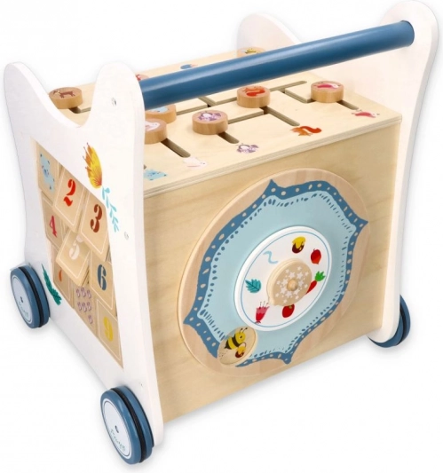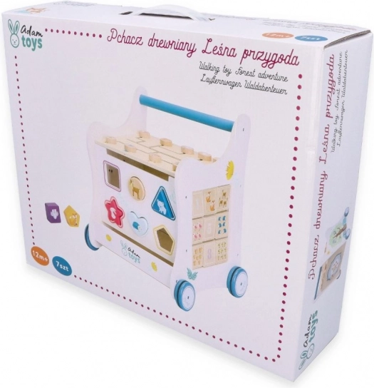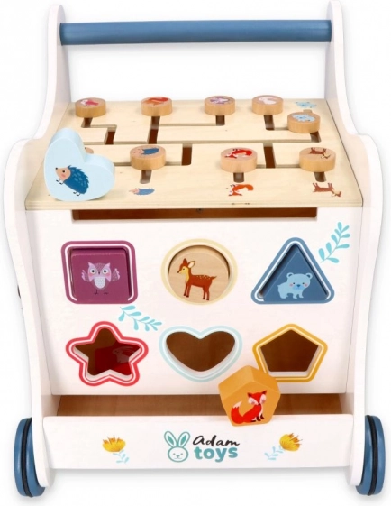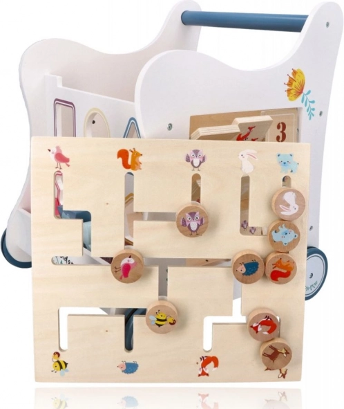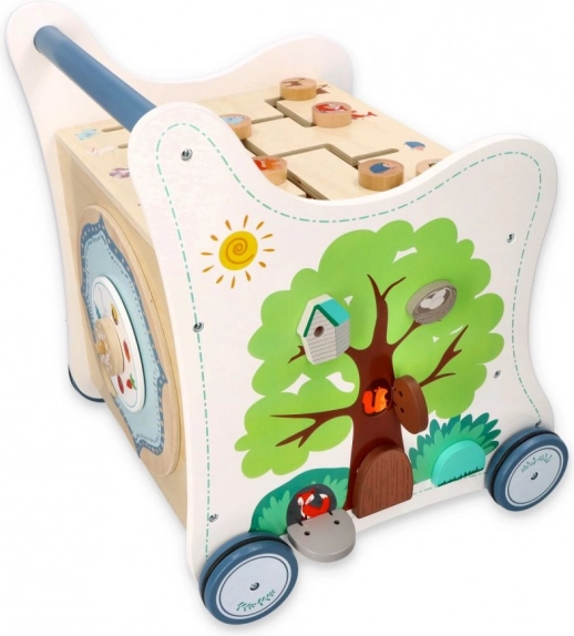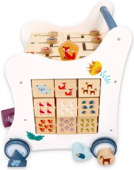 Ta leseni potisni hojnik popelje vašega malčka v svet barv, oblik in gozdnih živali. Sprednja plošča ponuja zabavno vstavljanko oblik, ki razvija fino motoriko, koordinacijo oko–roka in logično mišljenje. Na vrhu čaka labirint s premičnimi kroglicami, ki podpira potrpežljivost, načrtovanje in prostorsko predstavo. Bočne ilustracije z živalmi navdihujejo raziskovanje narave in izmišljanje lastnih zgodb.