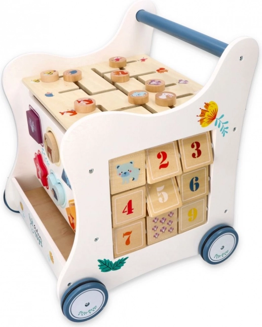 Hojnik raste z otrokom – od prvih korakov in urjenja ravnotežja do igrivega učenja števil z vrtljivimi elementi 1–9. Proti-zdrsna kolesca zagotavljajo gladko in stabilno gibanje brez poškodovanja tal, konstrukcija je trdna, robovi pa gladko obrušeni. Zgornja plošča je odstranljiva, zato lahko služi kot skrivni predal za zaklade ali kot voziček za najljubše igrače. Enostavno vzdrževanje – preprosto obrišite z vlažno krpo; preprosta montaža s priloženimi navodili.