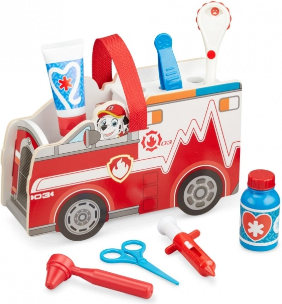 Podpira igro vlog, razvoj fine motorike in socialnih veščin. Otroci preizkusijo delo reševalcev in zdravnikov z dodatki, kot so injekcija, škarje, steklenička ali značka. Praktičen ročaj omogoča, da igro vedno vzamete s seboj.