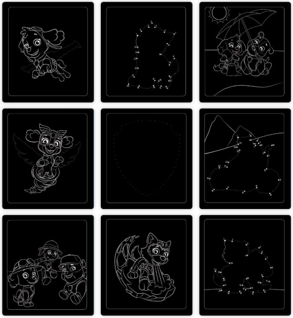 Komplet vsebuje šablone z različnimi oblikami, ki otrokom pomagajo ustvarjati natančne slike in razvijati fino motoriko.
