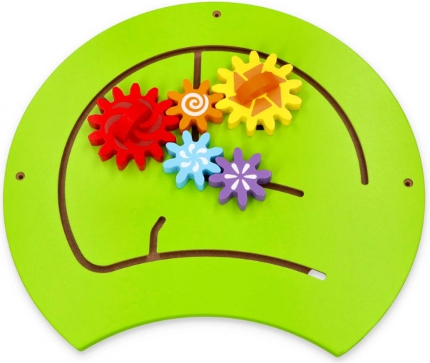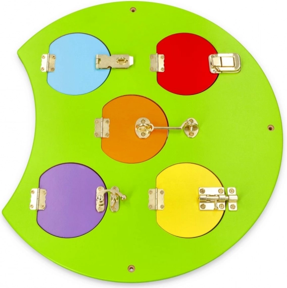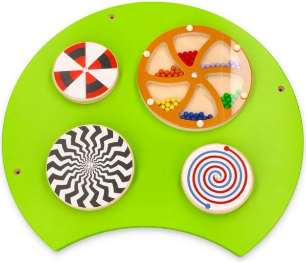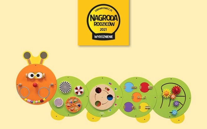 Raziščite svet poln barv s to stensko sestavo v obliki gosenice. Vsebuje pet interaktivnih delov, ki otrokom omogočajo učenje in razvoj različnih veščin skozi igro: