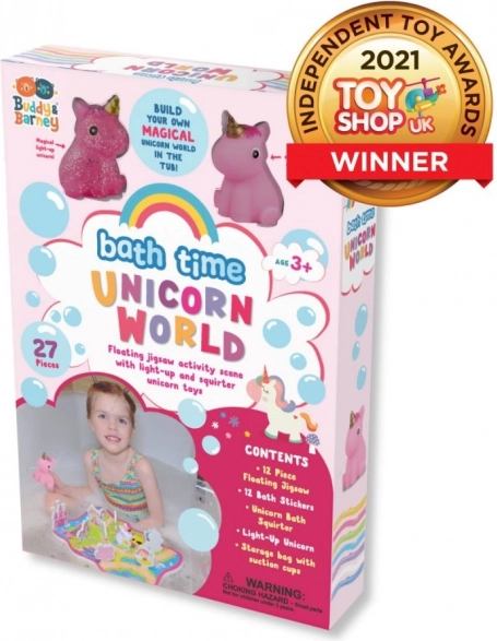 Barvni penasti koščki plavajo na vodi in se po navlažitvi oprimejo sten kadi. Otroci si lahko sestavijo svoj samorogovski svet ter se učijo oblike in barve.