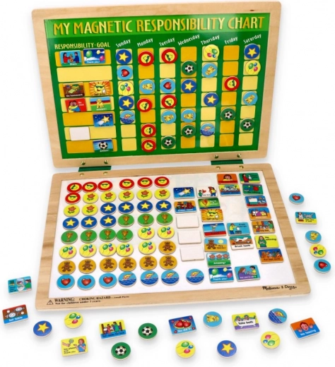 Tabla je opremljena z različnimi barvnimi magnetnimi karticami, ki ponazarjajo gospodinjska opravila, kot sta postiljati posteljo ali pospraviti igrače. Vsaka kartica je vizualni opomnik, ki spodbuja otroke k odgovornosti in oblikovanju rutine.