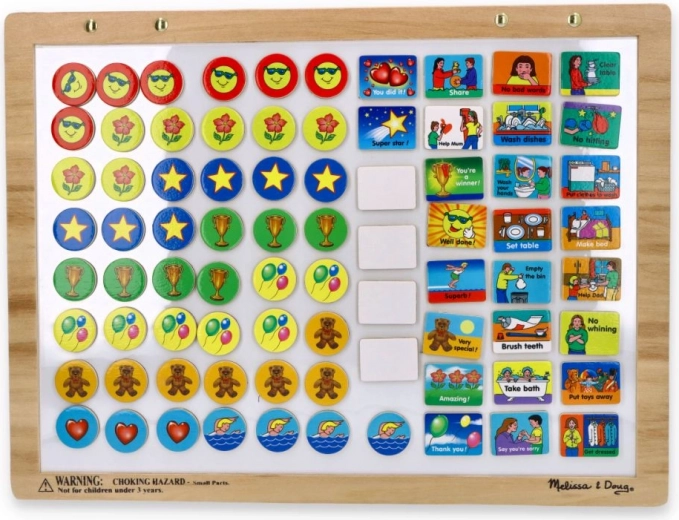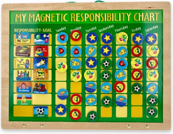 V svoj dom vnesite red in odgovornost s to leseno magnetno tablo. Otroci lahko preprosto prestavljajo magnete, da si ustvarijo lastne sezname obveznosti ter beležijo dosežene cilje.