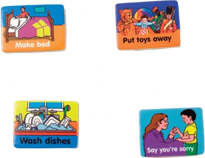 Štiri različne kartice ponazarjajo gospodinjska opravila, kot sta postiljanje postelje ali pomivanje posode, ter pomagajo otrokom, da se spomnijo svojih obveznosti.