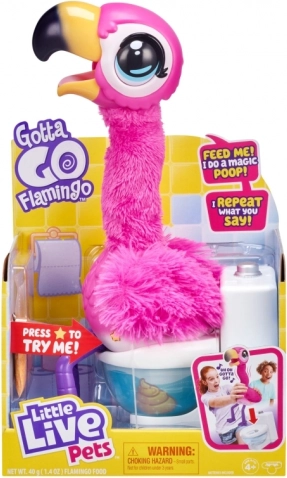 Zabavni interaktivni flamingo Little Live Pets bo razveselil otroke, saj ga lahko hranijo s posebnim peskom Aqua, poje, pleše, govori in po jedi odide na stranišče. To naznani z angleškim stavkom “Uh, oh, I gotta go”, ponavlja besede svojega lastnika in zahvaljujoč večkrat uporabnemu pesku znova in znova poskrbi za zabavo.