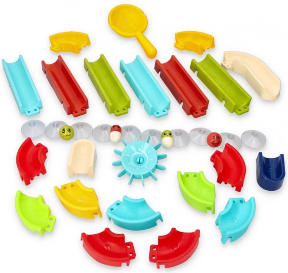 Zahvaljujoč priseskom elementi trdno držijo na ploščicah ali kadi, skupna dolžina proge do 173 cm pa nudi dovolj prostora za domišljijo. Set je primeren za otroke od 3 let in spodbuja koordinacijo oko–roka, potrpežljivost in prostorsko predstavo.