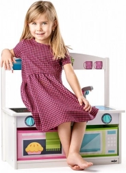 V načinu kuhinjice otroci posnemajo odrasle, se učijo osnov kuharskih opravil in razvijajo domišljijo. Po preoblikovanju v klop dobite praktičen prostor za sedenje ali počitek. Kompaktne mere 59 × 58 × 31,5 cm prihranijo prostor in naredijo to igračo odlično izbiro za manjše sobe.