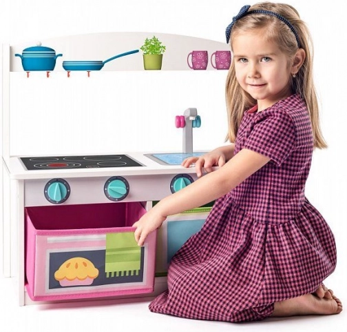 Vrtljivi gumbi, pomivalno korito s pipo in grafika aparatov spodbujajo domišljijo ter otroke učijo osnov kuhinjskih opravil.