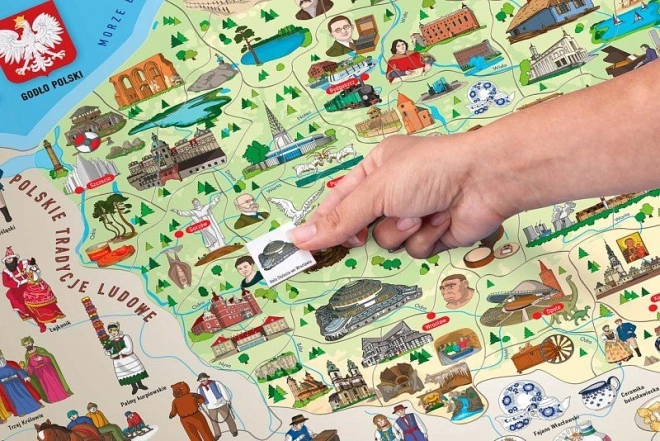 Magnetni zemljevid Poljske 3 v 1 iz lesa. Velik format 67 × 47 cm, za otroke od 4 let. Magnetni koščki, trpežna izvedba, učenje geografije na zabaven način.