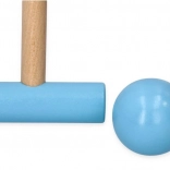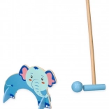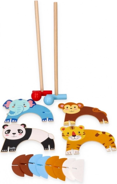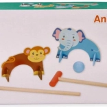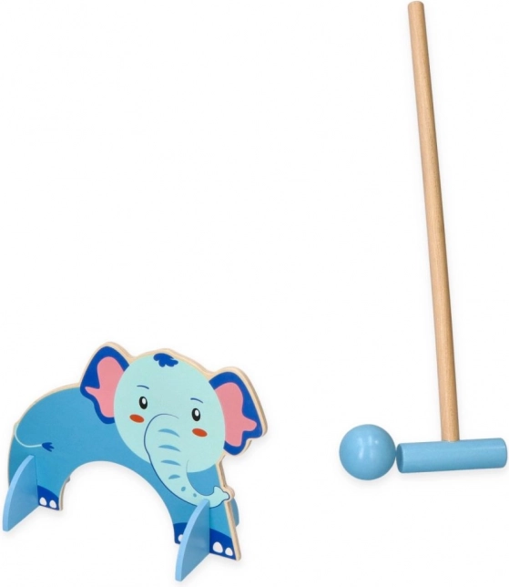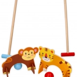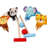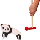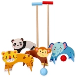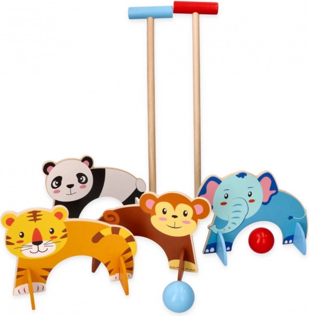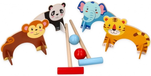 Ta leseni kroketni set je idealen za majhne otroke, ki želijo uživati v zunanji zabavi. Igra vključuje barvne palice in krogle, pri čemer ima vsaka vrata svoj živalski motiv, kar ustvarja interaktivno in domišljijsko igralno izkušnjo.