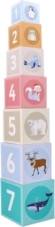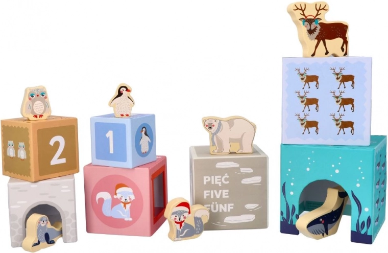 Vsaka kocka ponuja več kot le zlaganje: na njej najdete številke 1–7, ustrezno število živalic, podobe polarnih prijateljev in imena števil v treh jezikih (PL/EN/DE). Zahvaljujoč pametnim izrezom otroci zlahka ustvarijo hiške, zoo in male scenografije. Kocke je mogoče zložiti ena v drugo, zato se igrača preprosto shranjuje in prenaša.
