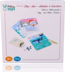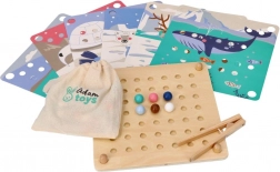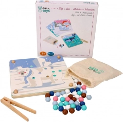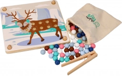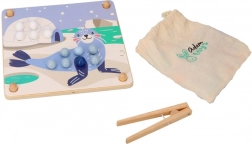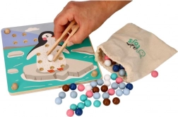 Ta zabavna izobraževalna igra združuje naravno otroško radovednost z urjenjem spretnosti: s pomočjo lesene pinzete otroci prenašajo kroglice in jih zlagajo v odprtine po barvah in po predlogah z motivi arktičnih živali (pingvin, tjulenj, severni jelen, polarni medved). Igra spodbuja koncentracijo, natančen prijem in zanesljivost roke – idealno za predšolske otroke.