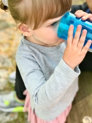 Otroci se učijo piti iz odprtega lončka naravno in varno. Nadzor pretoka pomaga omejiti razlitje pri prvih poskusih.