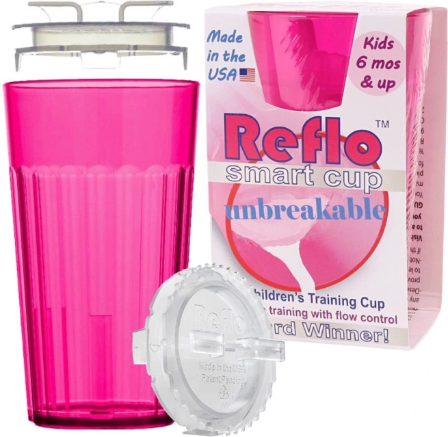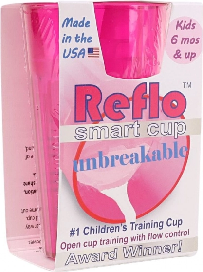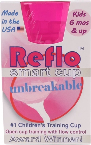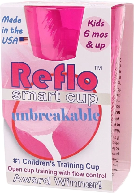 Rožnata vadbena skodelica Reflo pomaga otrokom od 6 mesecev varno osvojiti pitje iz odprte skodelice. Zahvaljujoč uravnavanju pretoka zmanjšuje razlitje, nezdrobljiva zasnova je idealna doma in na poti, kompaktna prostornina 170 ml pa je ravno pravšnja za otroško roko. Izdelano v ZDA, ustreza EN 14350.
