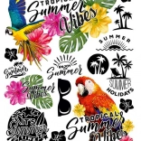 Veseli papagaji, cvetovi in napisi s počitniškim vzdušjem so primerni za majice, torbe in dodatke. Idealno za sezonske DIY projekte.
