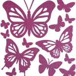Ti naprivni metulji so preprost način, kako popestriti katerikoli tekstilni izdelek. Vsak mali list vsebuje več različic izrezov metuljev iz vijoličastega bleščečega papirja, ki se enostavno prenesejo na izbrane tekstilne površine.