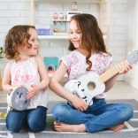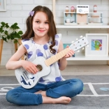 S šestimi strunami in klasičnimi uglaševalnimi mehanizmi lahko otroci slišijo razliko med toni in se učijo akordov kot na pravi kitari.