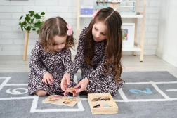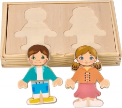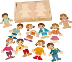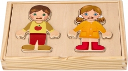 Ta lesena magnetna sestavljanka z likoma dečka in deklice ponuja številne možnosti, kako ju obleči in kombinirati posamezne dele. Otroci med igro urijo koordinacijo oko–roka, logično razmišljanje ter zaznavanje oblik in barv.