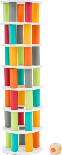 V kompletu je igralna kocka z barvami, ki določa, kateri delček mora igralec izvleči ali dodati. Zaradi kakovostnega lesa in varne izdelave je igra primerna za vsakodnevno igranje. Stolp lahko doseže višino do 35 cm, kar prispeva k vznemirjenju in treningu potrpežljivosti.
