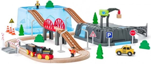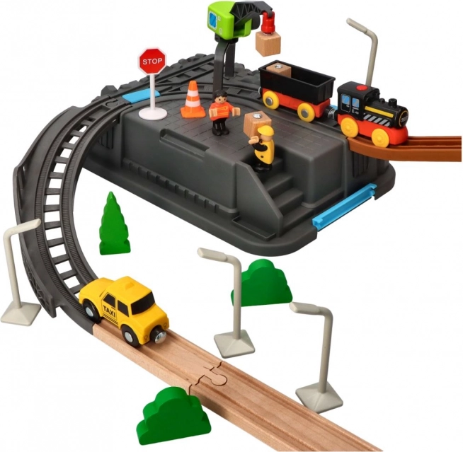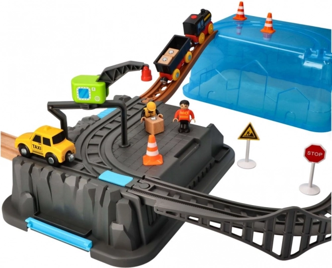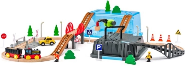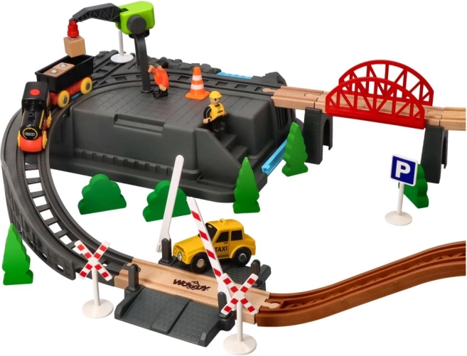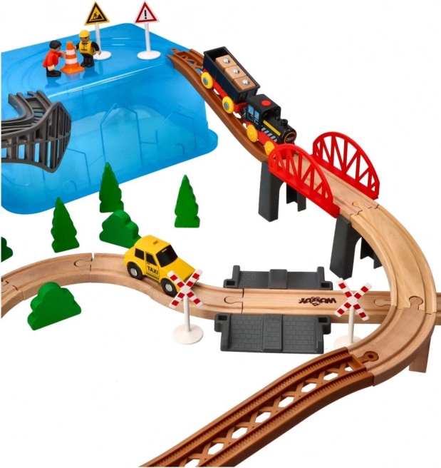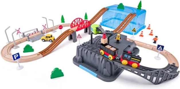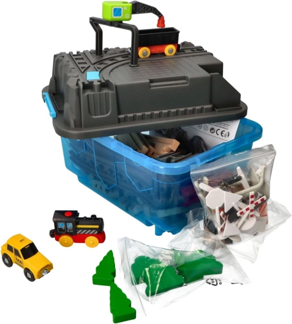 Ta otroški komplet železnice s 63 deli ponuja nešteto možnosti za ustvarjalno igranje. Komplet je idealen za razvoj motoričnih spretnosti in domišljije otrok. Vsebuje barvite vlake, mostove, drevesa, prometne znake in druge dodatke, ki prinašajo v igro realistične elemente.