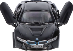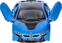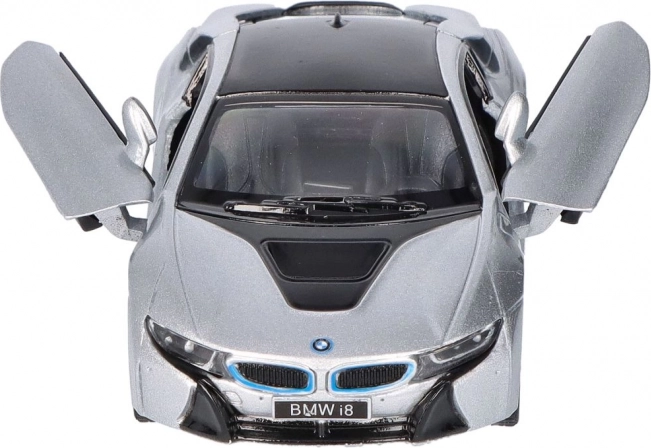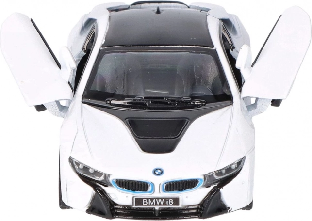 Podrobna izdelava kovinskega modela BMW i8 vključuje natančne oblikovne elemente, kot sta prepoznavna BMW-ledvičasta maska in oblika žarometov.