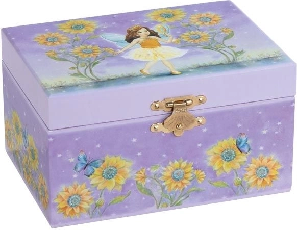 Ta škatlica za nakit v slogu klasične glasbene skrinjice razveseli vsakega otroka, ki želi svoje zaklade shraniti z eleganco. Po odprtju pokrova zazveni nežna melodija iz baleta Labodje jezero, mala vrteča se baletka pa zapleše pred vgrajenim ogledalom. Motiv sončnice škatlici doda igriv in hkrati nežen videz.