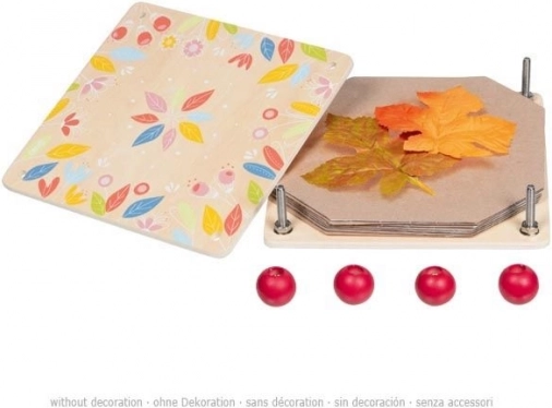 Stiskalnica je sestavljena iz dveh lesenih delov, štirih vijakov v vsakem kotu in kartonskih pregrad.