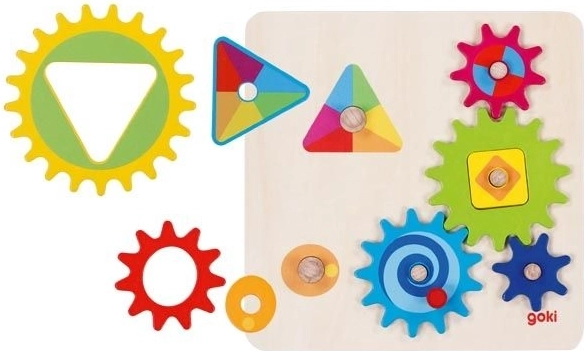 Ta lesena logična igra znamke GOKI razvija otroško domišljijo in potrpežljivost. Otroci polagajo barvne zobnike na podlago in preizkušajo, ali se po namestitvi modrega kolesa vsa kolesca pravilno zavrtijo – in v katero smer. Kreativno in igrivo učenje vodi k razumevanju osnov mehanike ter vzroka in posledice.