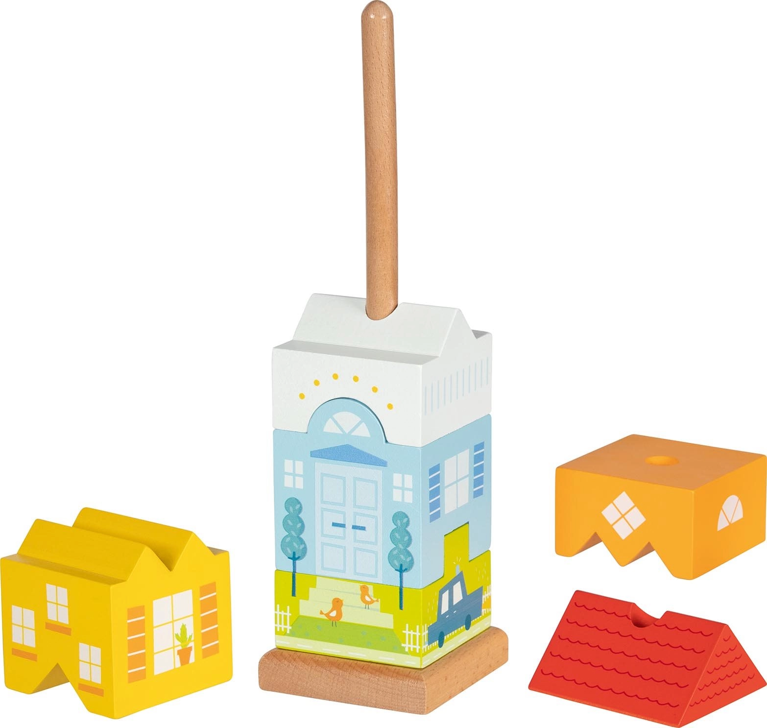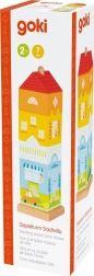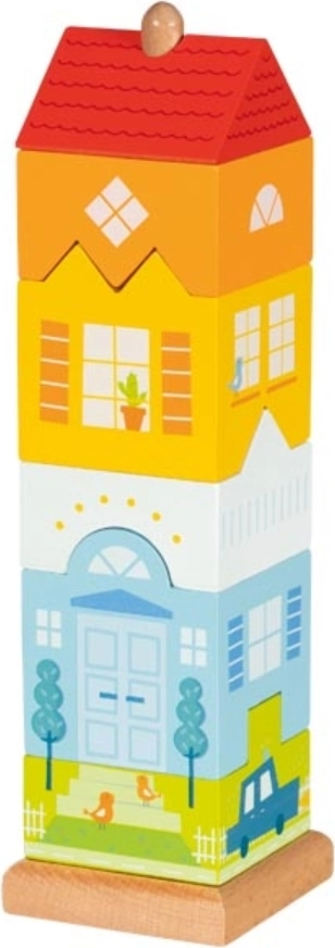 Tukaj je tipična mestna hiša. Set je sestavljen iz barvitih blokov, pri čemer je vsak drugačen in vsak se na prejšnji blok navezuje na nekoliko drugačen način. Ta mestna hiša je sestavljena iz 6 blokov in podstavka. Kljuk je pritrjen na vrvico. Vsak naslednji blok predstavlja drugo nadstropje in drugačen blok. .