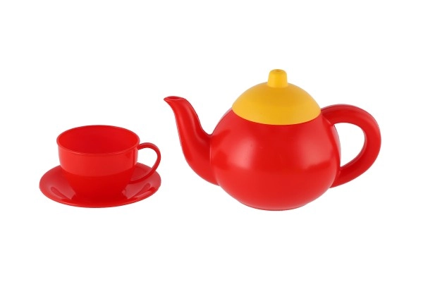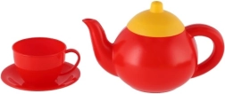Rdeč čajnik in štiri barvite skodelice s krožnički omogočajo pripraviti in “postreči” čaj vsej družini ali prijateljem.