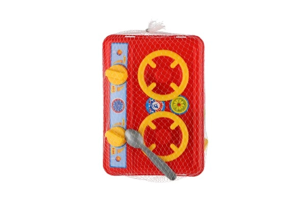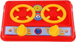 Rdeč kuhalnik z dvema ploščama in vrtljivimi gumbi spodbuja domišljijo ter otroke uči osnov kuhanja pri varni igri.