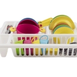 Sestavni del je praktični cedilnik, v katerega otroci po igri posodo udobno pospravijo. Igra vlog podpira samostojnost, gostoljubnost in dobre navade – od kuhanja in pogrinjanja do pospravljanja.