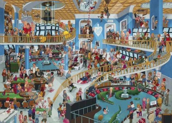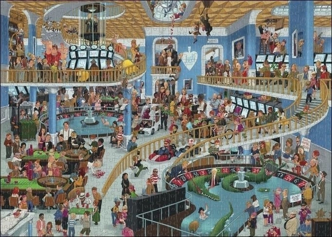 HEYE Sestavljanka Kaotična Kazino, 1000 koščkov, netipična škatla, plakat, karikatura, 70x50 cm.